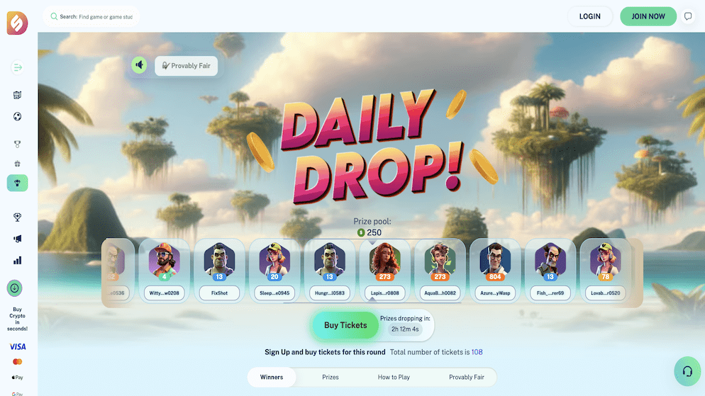 The DailyLotto is a major highlight at Dailyspins. Every deposit grants a free ticket, and players can buy additional tickets for just $0.20. With a daily draw at 00:00 UTC and a Provably Fair system, it offers a transparent shot at a massive $20,000 prize pool every single day.