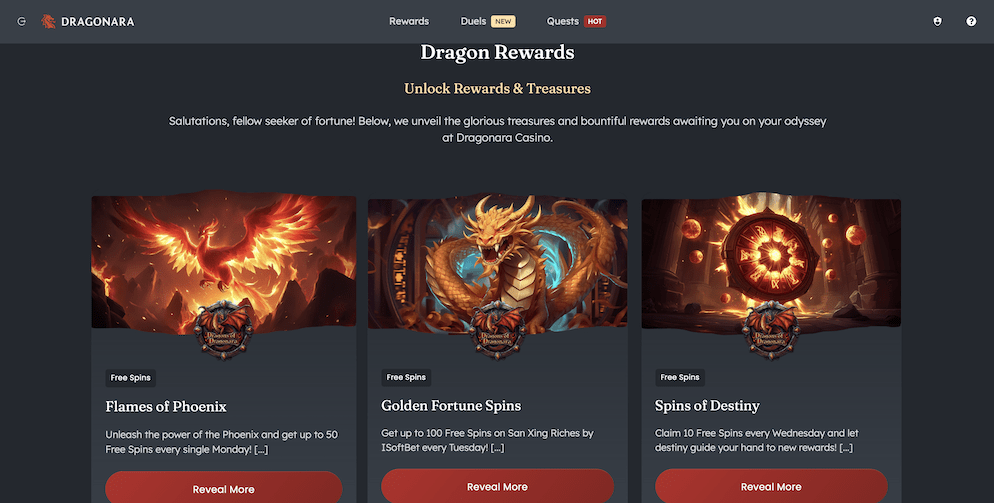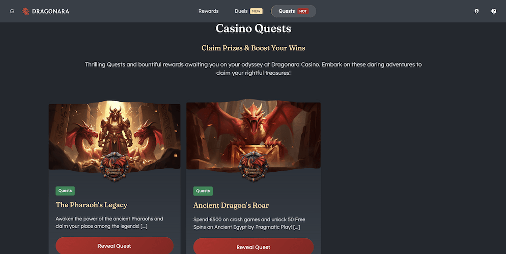 Dragonara keeps the excitement high with a diverse and generous lineup of promotions for both new and existing players, including insanely rewarding quests that turn regular gameplay into a thrilling adventure.