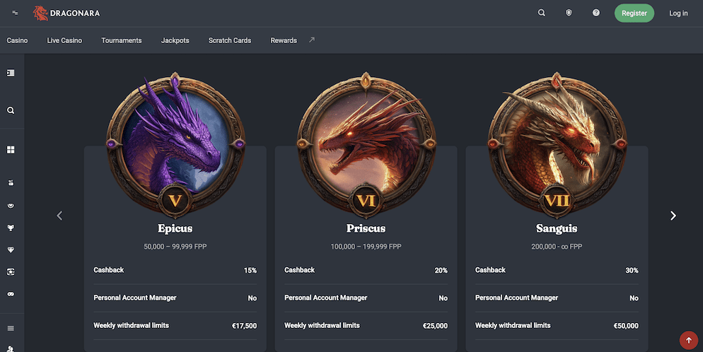 Dragonara rewards its most loyal players through an exclusive 8-tier VIP Club. As players ascend through levels—from Ovum Ignis up to Sanguis—they unlock a cascade of excellent perks designed to enhance their gaming experience, most notably significantly higher Weekly Withdrawal Limits. The limit starts at €7,500 for the lower tiers and reaches a generous €50,000 for the top tier, Sanguis.