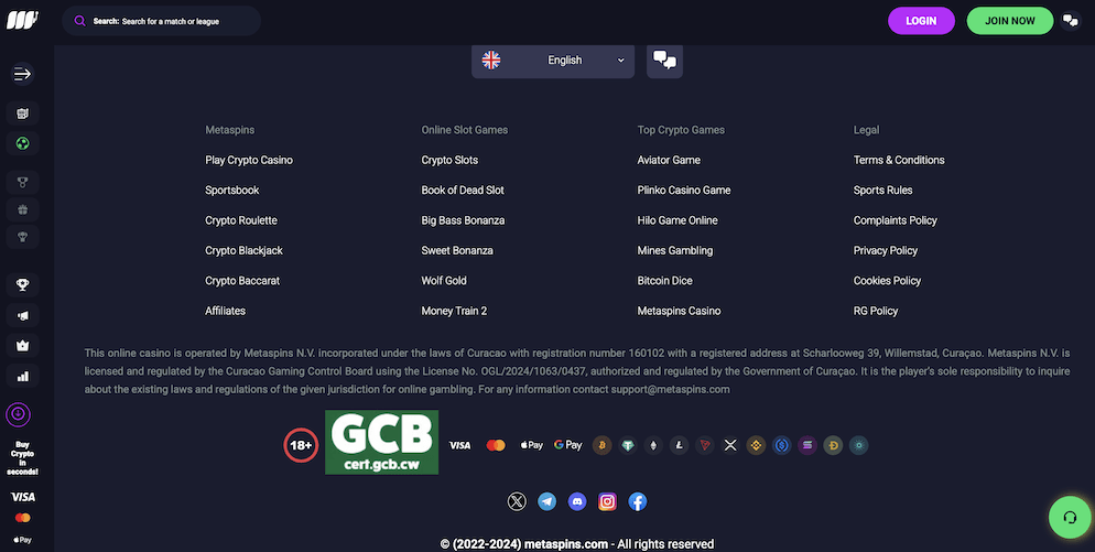 Metaspins Casino is regulated and operates with a Curacao gaming license.