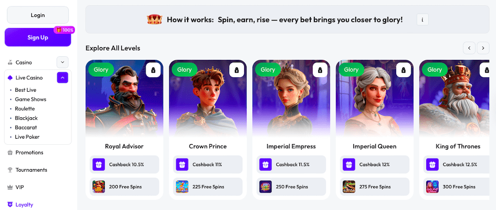 This is evident through the recurring use of regal, cartoon-styled characters in key promotional and reward areas, such as the welcoming King figure on the homepage and the structured ‘Glory’ tiers within the Loyalty Program, named after figures like the Crown Prince, Imperial Empress, and King of Thrones.