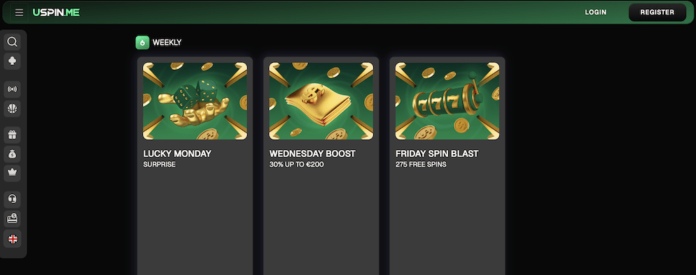 Uspin.me keeps the excitement high with an incredibly lucrative lineup of promotions for both new and existing players. The promotional calendar is packed with offers designed to boost your bankroll.