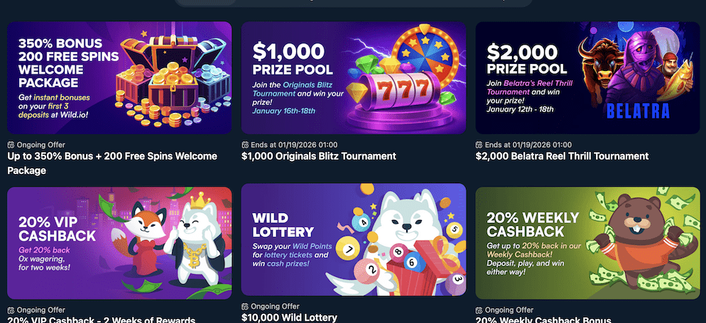 Wild.io keeps the excitement high with a diverse and generous lineup of bonuses for both new and existing players. The promotional calendar is packed with deposit matches, tournaments, and a wheel of fortune designed to boost your bankroll.