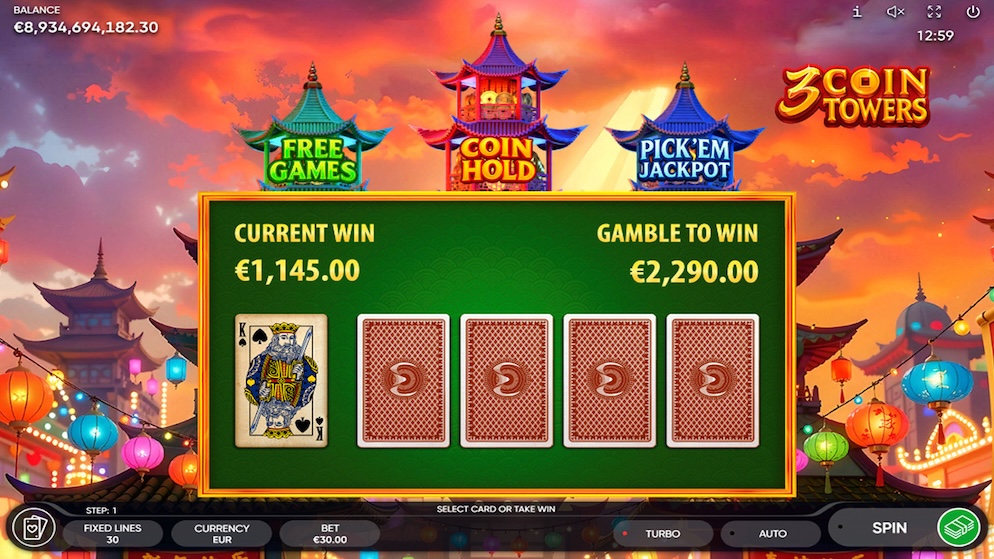 Kicking off the action on a 5-reel, 3-row grid with 30 fixed paylines, the 3 Coin Towers slot delivers a High volatility experience. It is backed by a solid RTP of 96.08%, with a focused max win potential of x1,000 your bet. The bet range is highly inclusive, ranging from €0.30 to €180, catering to both casual players and high rollers.