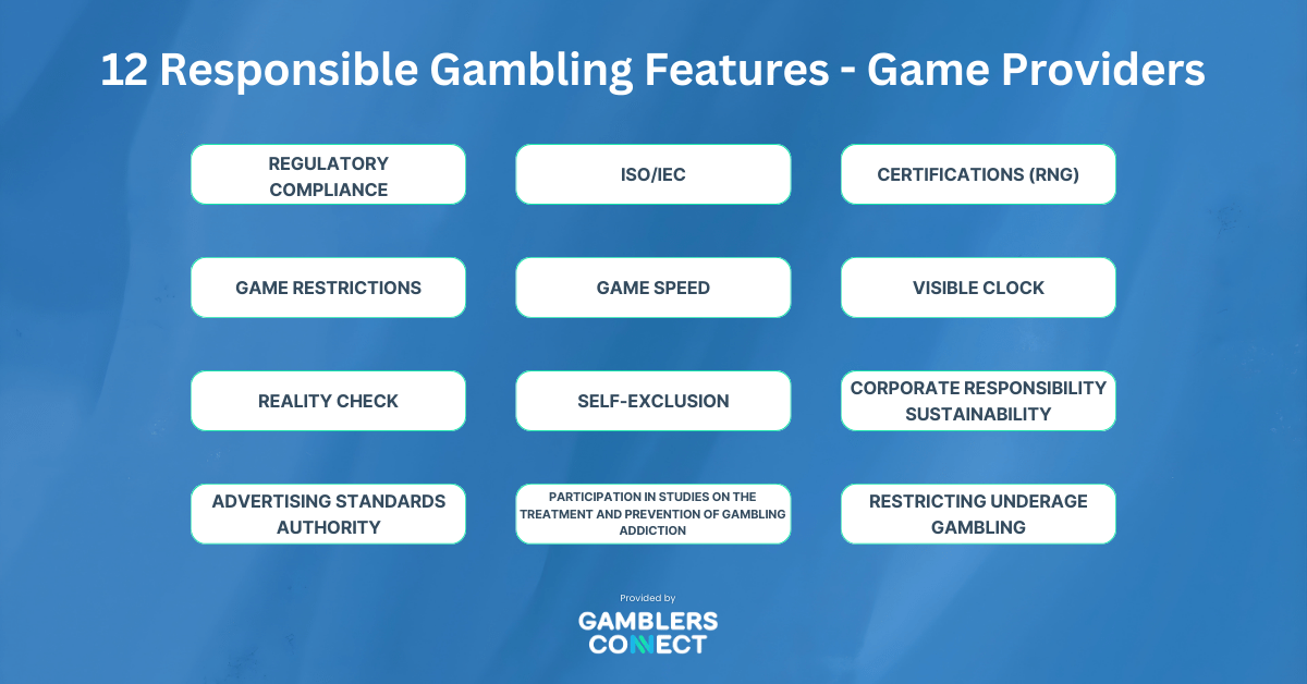 For game providers, we apply a specialized set of criteria tailored to the development side of the industry. This includes Regulatory Compliance and ISO/IEC Certification to ensure technical and legal adherence, alongside RNG Certifications for fairness. We evaluate in-game safety mechanics such as Game Restrictions (API functions for limits), Game Speed adjustments, Visible Clocks, and Reality Checks embedded directly into the software. Furthermore, we score based on Corporate Responsibility, which covers adherence to Advertising Standards, participation in addiction research studies, and active measures for Restricting Underage Gambling.